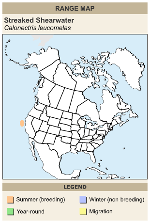 This species is pelagic, but also occurs in inshore waters. It occurs in the Pacific Ocean, nesting in Japan and many of its offshore islands. After breeding, the Streaked Shearwater will migrate toward southern Australia. It has been reported well off the west coast of the United States.