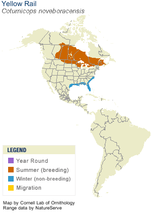 The Yellow Rail are very elusive and seldom seen; when approached, they are more likely to rely on camouflage than flight. The bird's call, usually given at night, sounds like two stones being clicked together. Their numbers have declined in recent years due to loss of habitat.